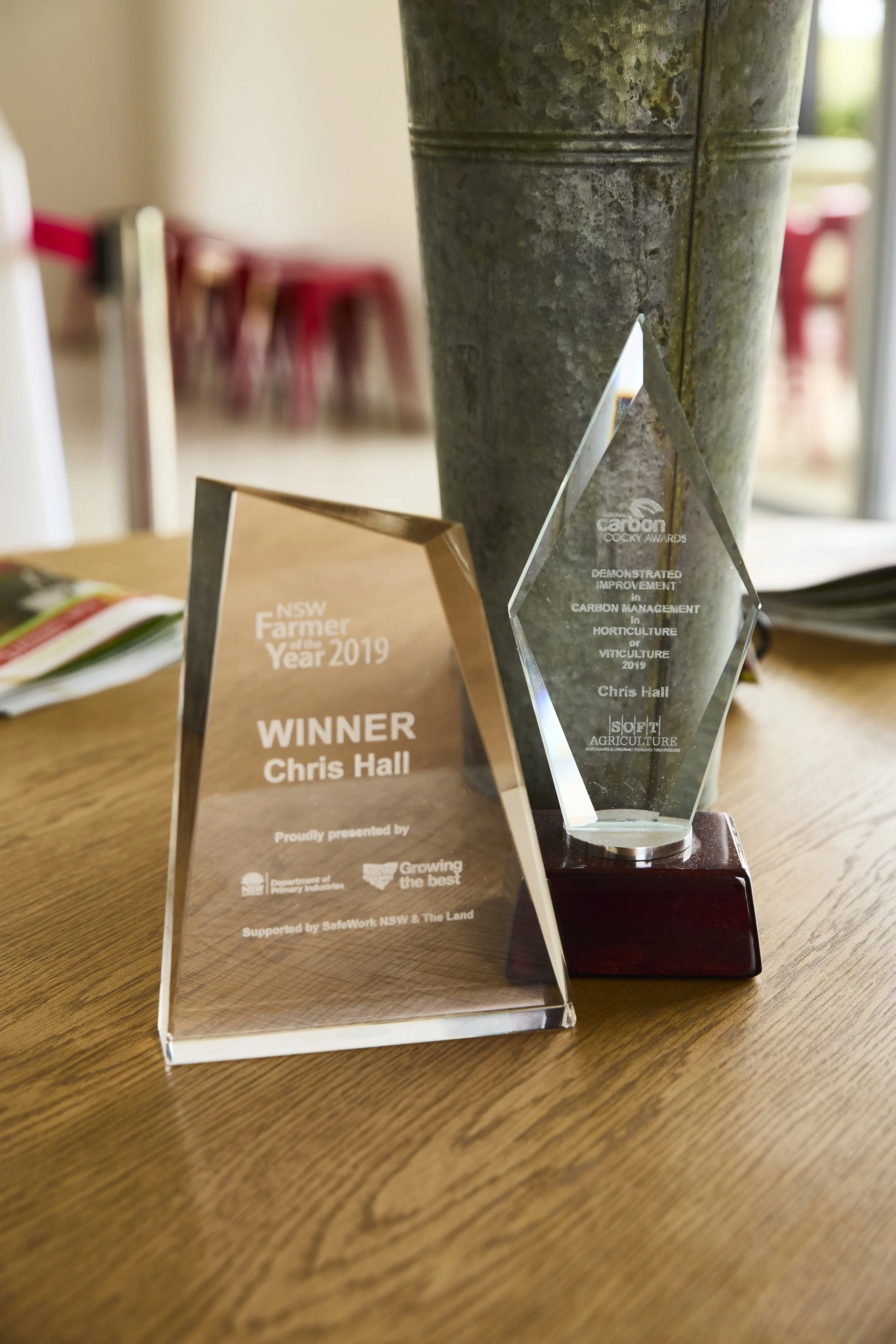 Hall Family Orchards has received numerous awards. In 2019, Chris was awarded a National Carbon Cocky Award for demonstrated improvement in carbon management in horticulture or viticulture. He was also a finalist in the National Carbon Cocky Award for outstanding performance in soil carbon sequestration. At the end of 2019, Chris was named NSW Farmer of the Year.